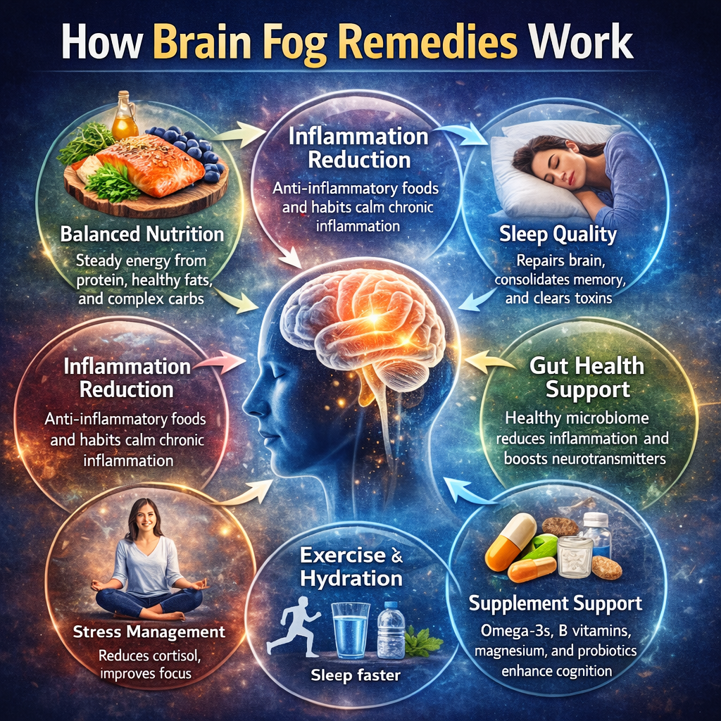 Brain fog remedies restore mental clarity by targeting key causes. Balanced nutrition fuels the brain, while gut health support reduces inflammation and improves signaling. Quality sleep allows brain repair, and stress management lowers cortisol for better focus. Exercise, hydration, and supplements like omega-3s and B vitamins enhance cognitive function. Together, these strategies improve focus, memory, and energy, helping reduce and prevent brain fog which includes: